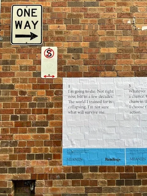 In 2012, I wrote an essay in The Emerging writer, Volume 3, a publication of the Emerging Writers Festival, on the writer as community builder, with the title ‘Writing on the Walls’. You can read a copy of my essay here. The text was oddly prescient of a future development, where fragments of my essay, Who Should Die and What Should We Do With the Bodies, hung on the walls of the Readings bookstore in Carlton for the launch of Meanjin, Autumn 2023.